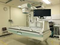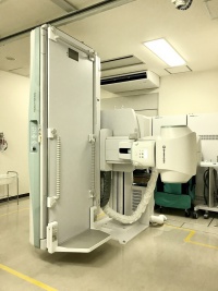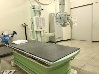 X線で単純撮影(レントゲン撮影)を行うところです。頭部、胸部、腹部、脊椎、その他全身の骨を撮影します。現在当院では、従来のX線フィルムに直接撮影する方法ではなくCsIシンチレータを利用したFPD(フラットパネルディテクタ)が導入され、以前より高精細な画像を他科に提供しています。また放射線科内では、高精細モニターのみで診断しています。