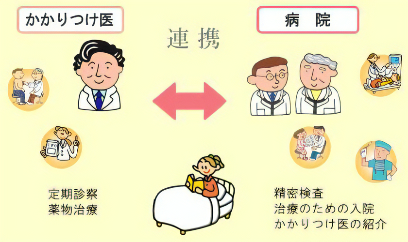 なお、当院の役割である専門的治療、高度医療機器による検査実施後は、再びご紹介いただいたかかりつけ医、または必要に応じて他の医療機関に、治療継続や経過観察等の役割をお願いすることになります。